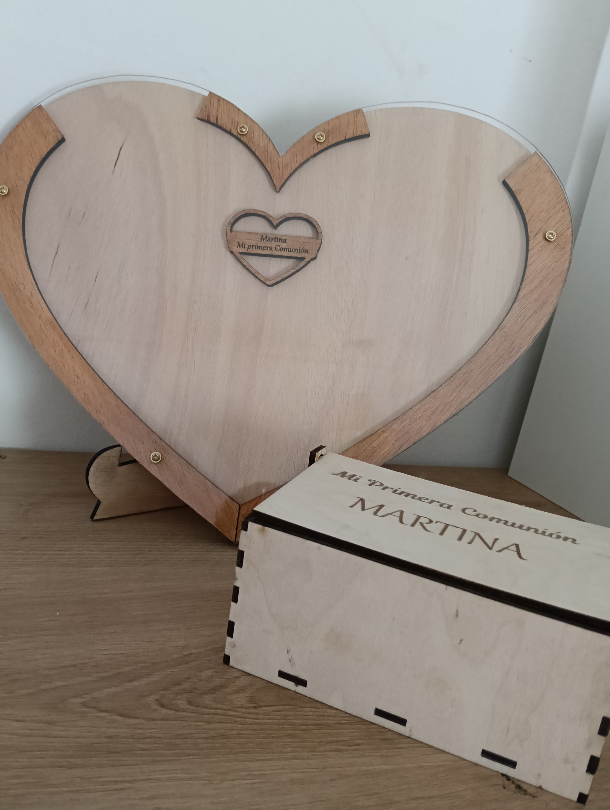 El corazón principal sirve como marco decorativo donde se van introduciendo los pequeños corazones de madera personalizados, creando un recuerdo único lleno de cariño. Cada invitado puede escribir su nombre o una dedicatoria y depositarlo dentro, formando un precioso recuerdo de la Primera Comunión, Bautizo o Boda que se podrá conservar para siempre.