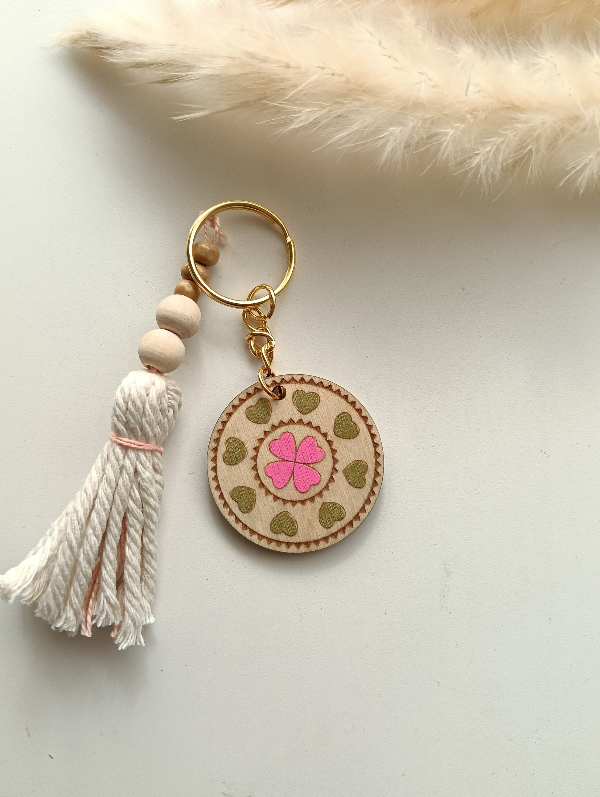 El trébol es un antiguo símbolo de protección y buena fortuna. Este llavero combina su forma con un grabado tipo mandala que representa la armonía entre lo que piensas, sientes y haces.