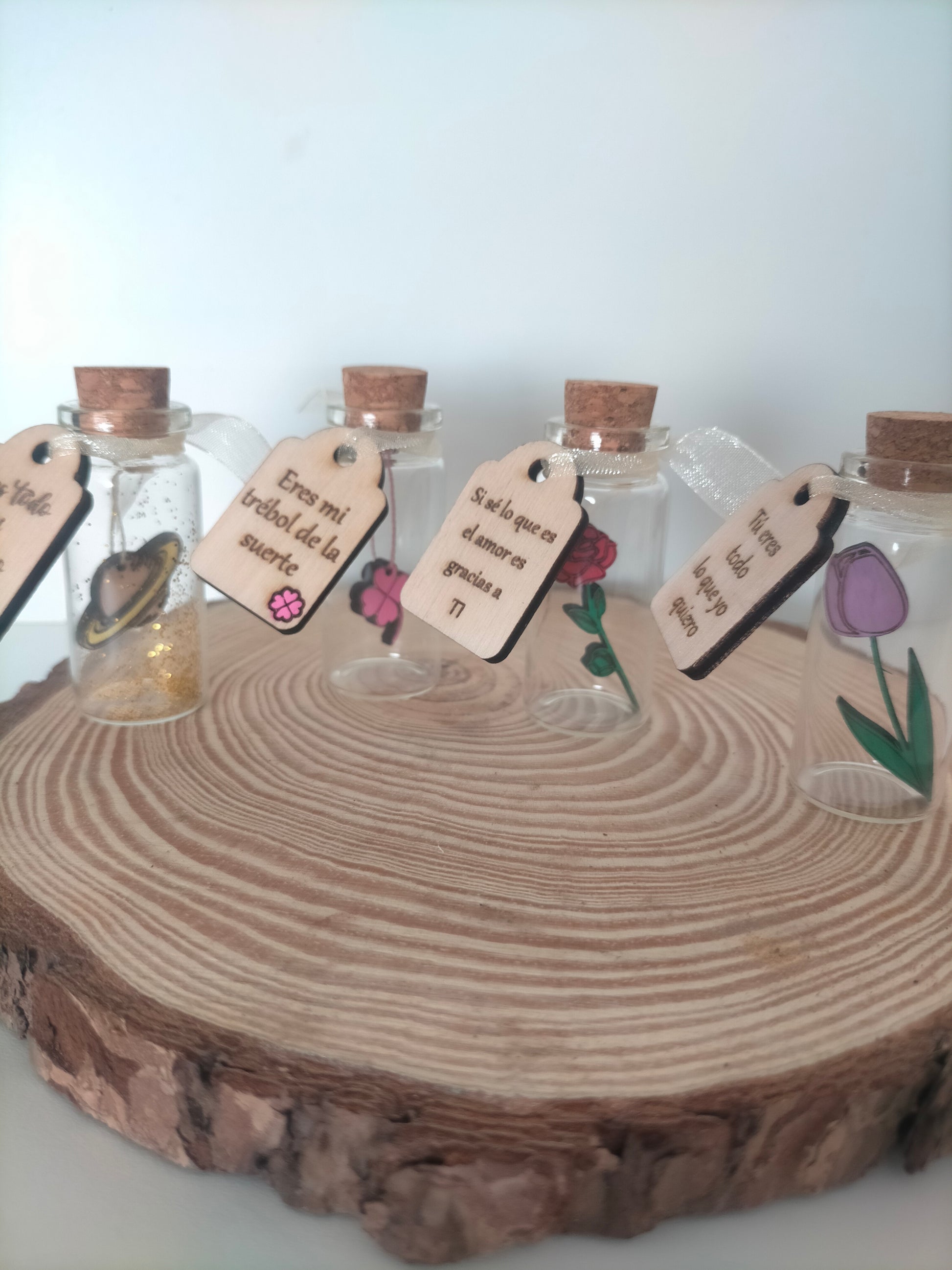 Estas mini botellas con mensaje son pequeños tesoros llenos de significado, diseñados para transmitir emociones de una forma delicada y original. En su interior incluyen una figura especial en madera —trébol, tulipán, rosa o planeta— acompañada de un mensaje que convierte cada pieza en un detalle único y memorable.