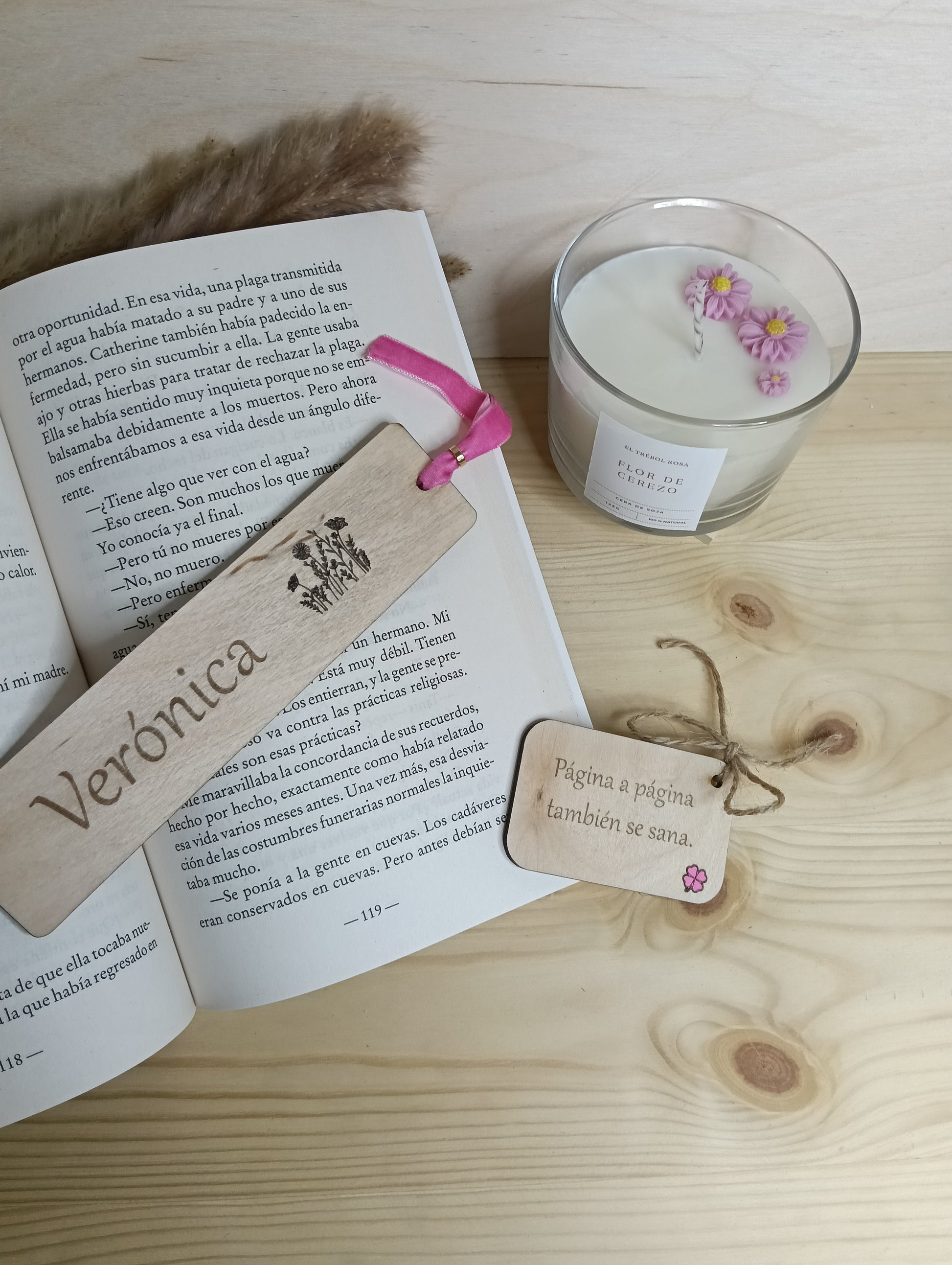 Este pack incluye un marcapáginas de madera grabado, una vela aromática artesanal de aroma suave y una mini tarjeta de madera con mensaje, ideal para acompañar ratos de lectura y descanso. Cada pieza está elaborada de forma artesanal, cuidando los materiales y los acabados para ofrecer un regalo especial y con significado.
